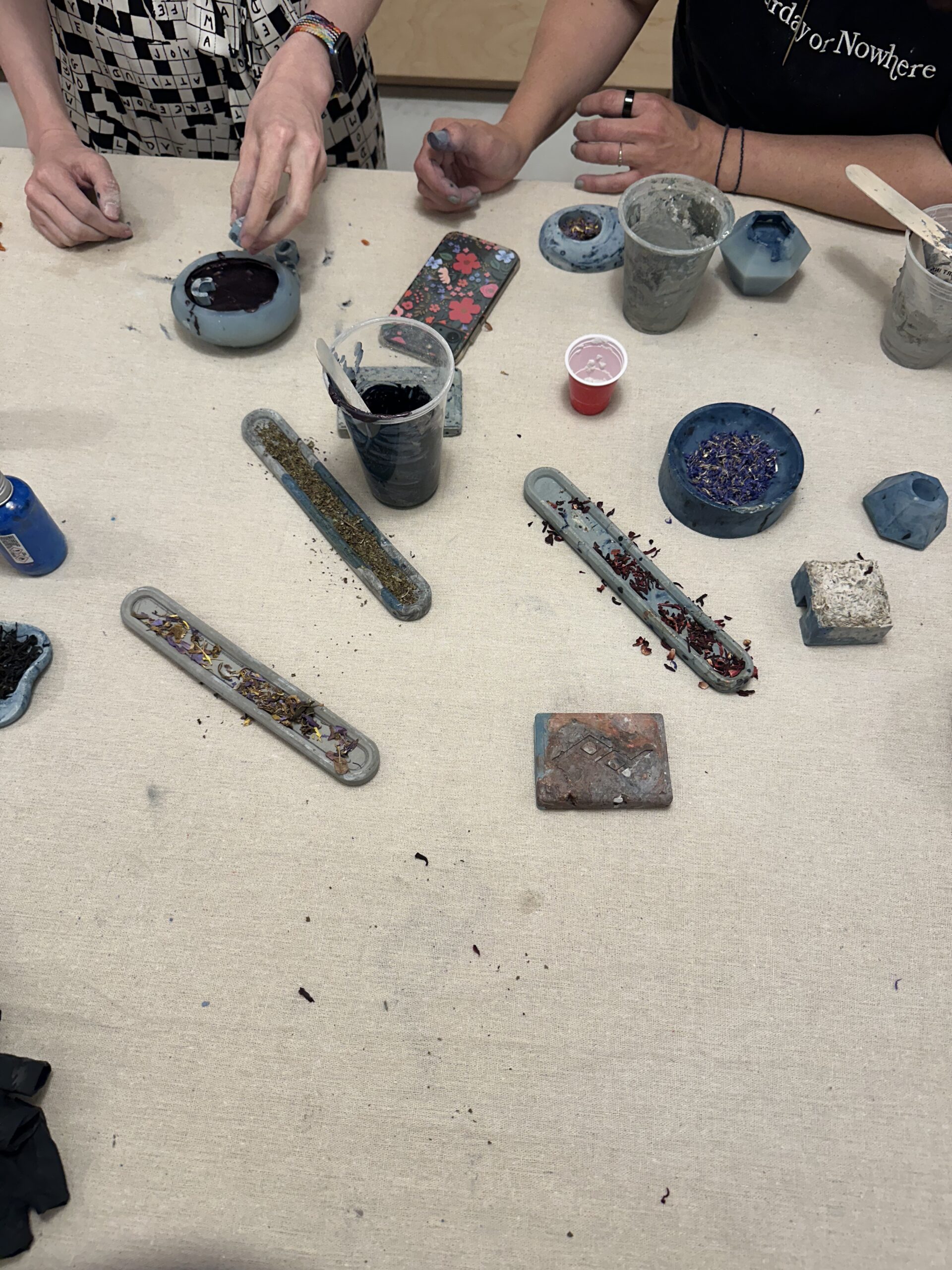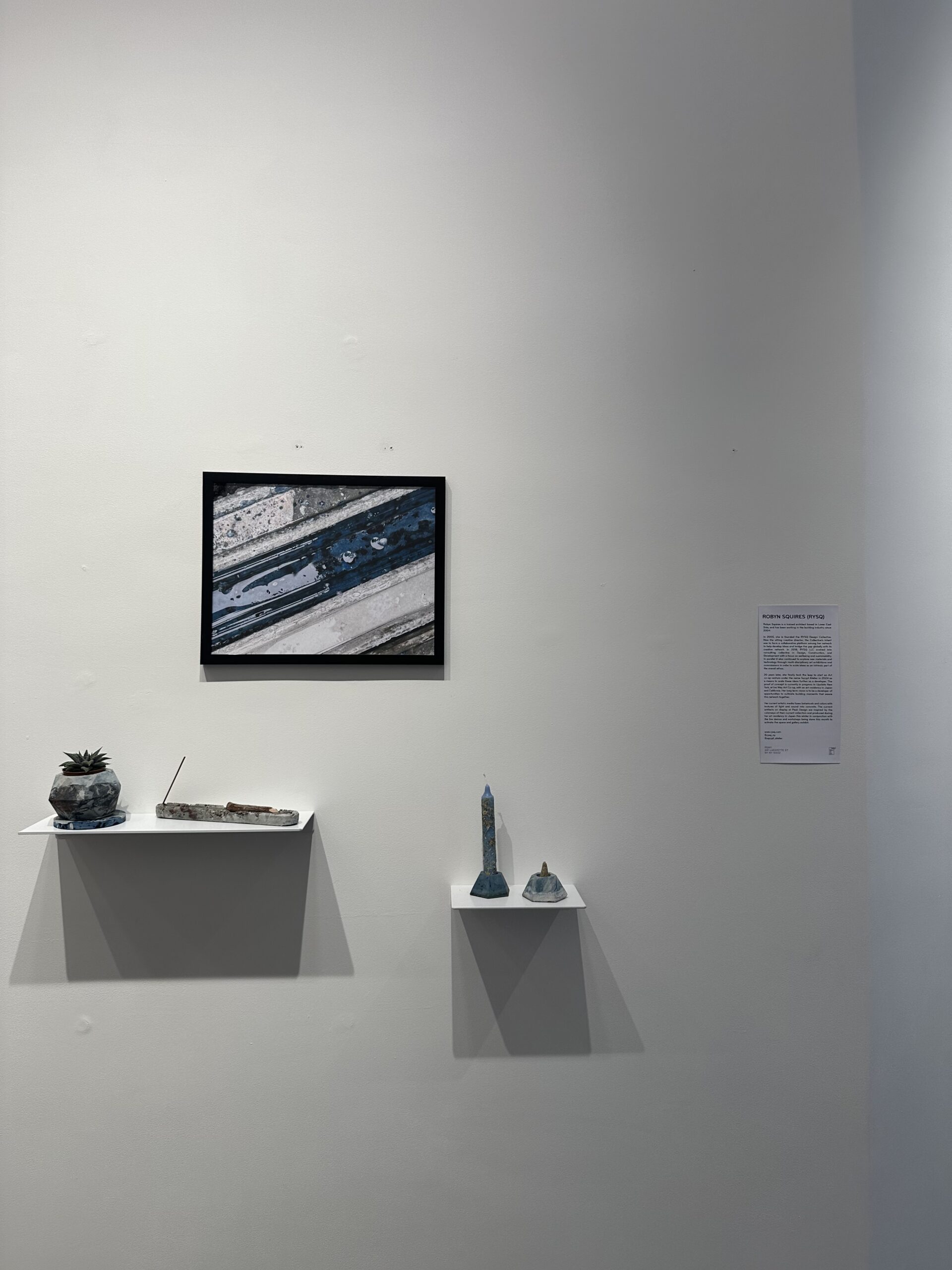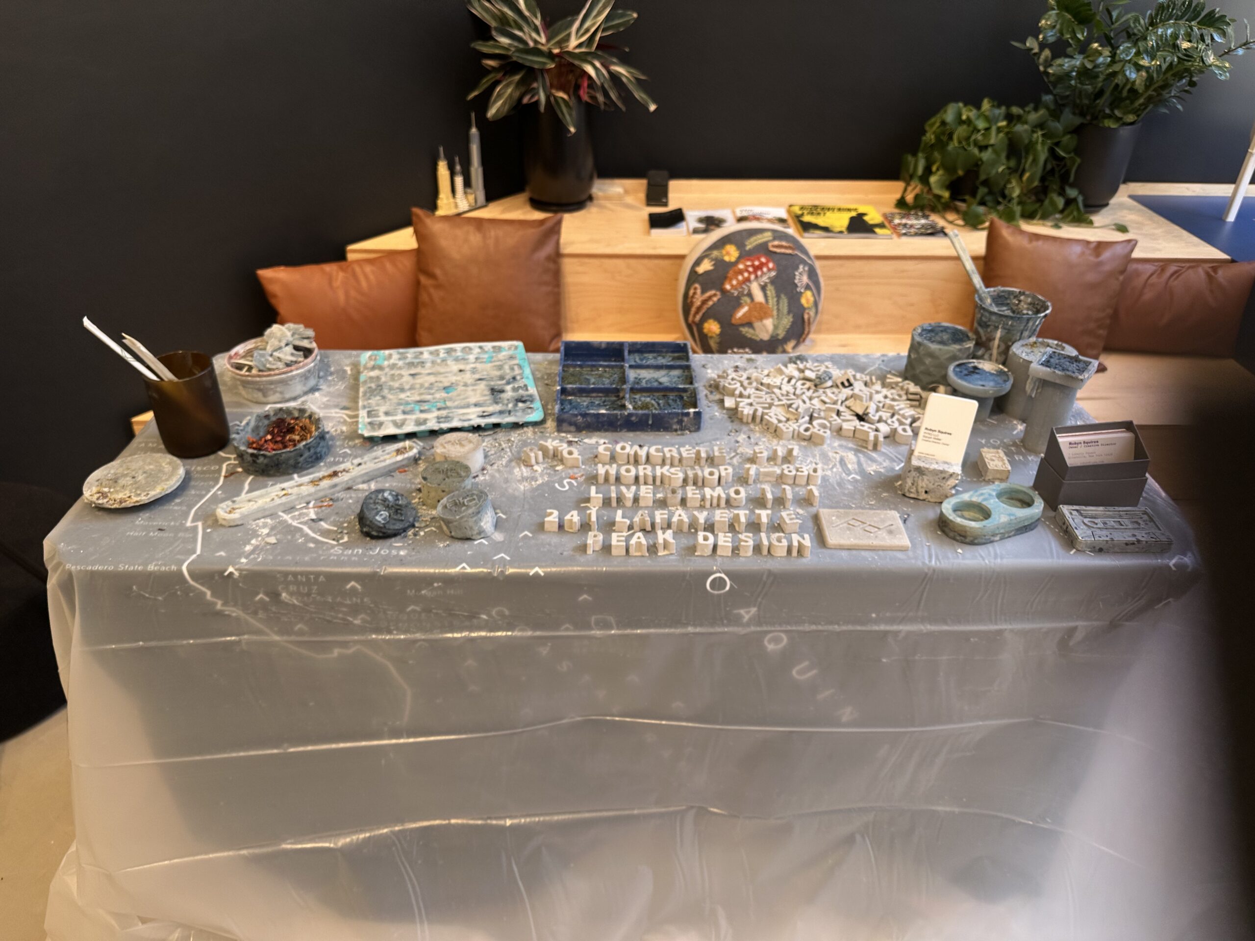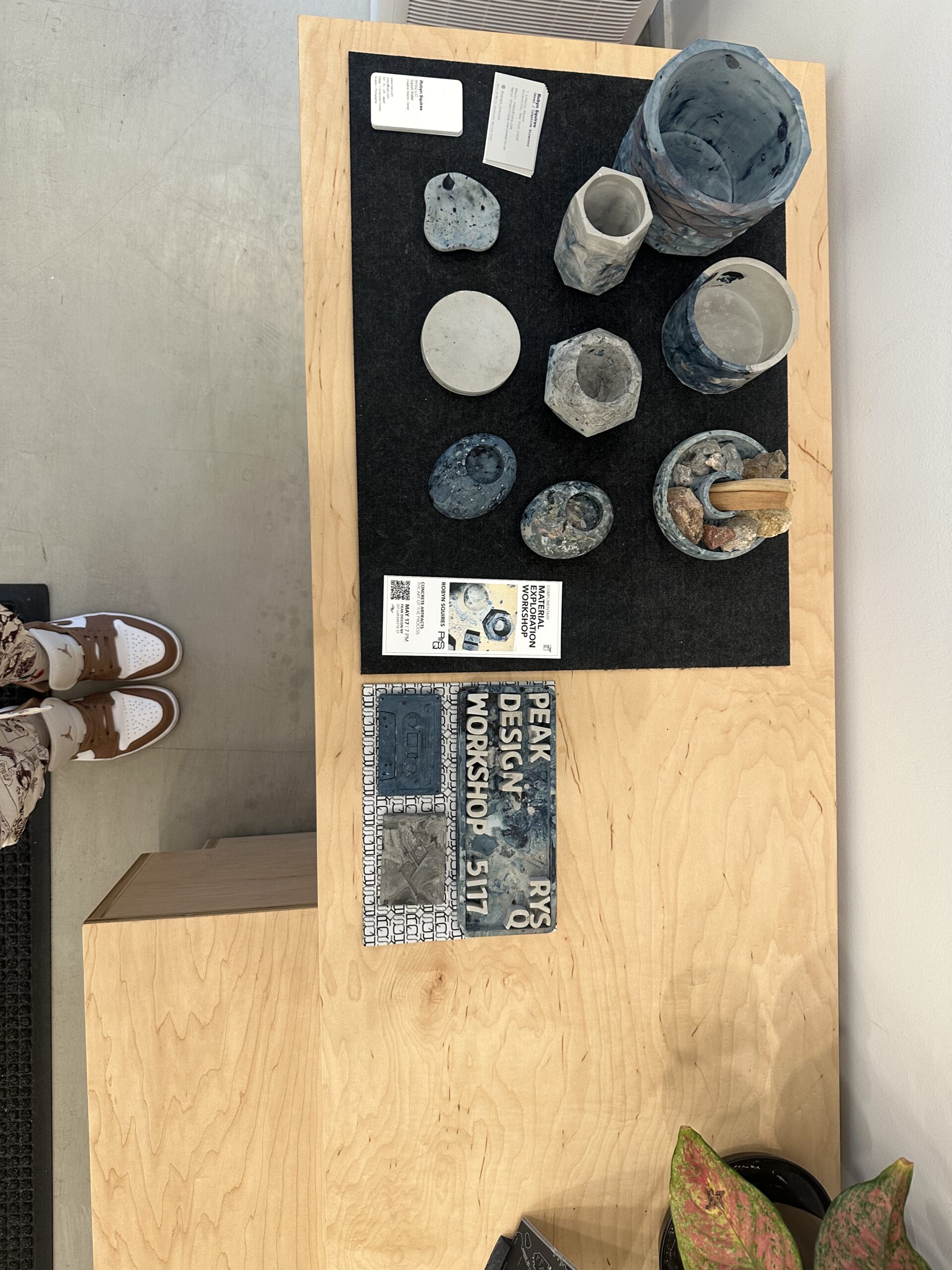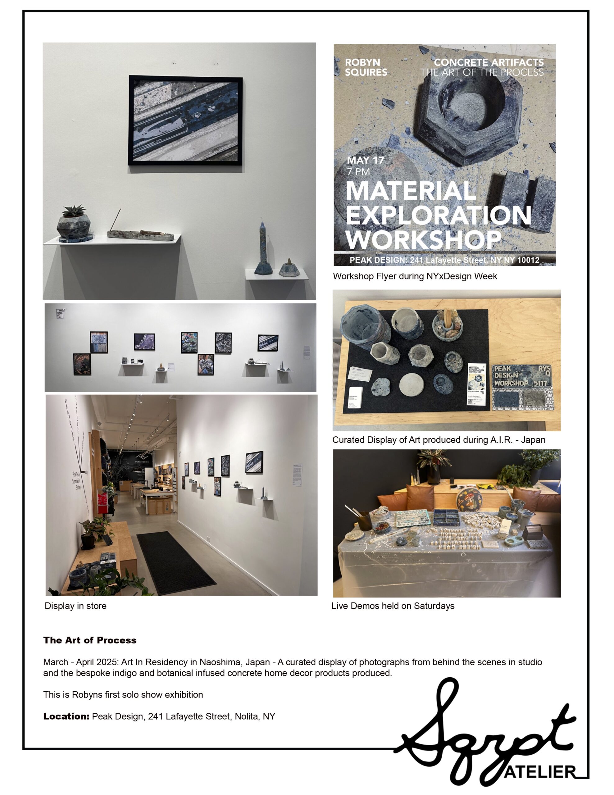 During NYC Design Week in May 2025, ‘ The Art of Process’ was exhibited on THE WALL of the Peak Design Showroom in Nolita on Lafayette. On Display for 3 weeks were curated images and concrete artifacts infused with Japanese indigo, and natural botanical dyes and ink that were part of Robyns Art in Residency in Naoshima, Japan during the time of the Setouchi Trienniale. It was quite an honor to not only showcase the work in the space for 3 weeks, but also conduct live demos on Saturdays and culminate the experience with a complimentary workshops for the Peak Design community. It was the largest workshop group today with 14 participants learning how to infuse paint and botanicals into bespoke concrete functional home decor products.